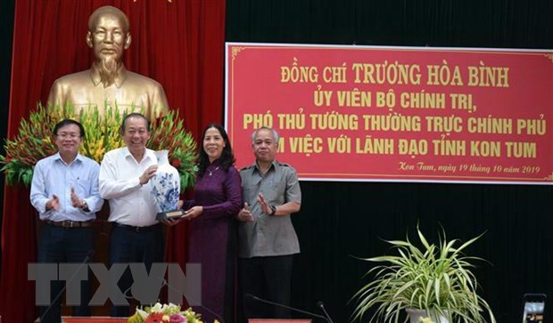 Về các nhiệm vụ, giải pháp trong thời gian tới, Phó Thủ tướng Thường trực Chính phủ Trương Hòa Bình lưu ý tỉnh Kon Tum cần tiếp tục thực hiện có hiệu quả các chỉ thị, nghị quyết của Đảng, Quốc hội, Chính phủ, quyết tâm phấn đấu hoàn thành và hoàn thành vượt mức các chỉ tiêu kinh tế-xã hội năm 2019; đổi mới, sáng tạo trong chỉ đạo, điều hành phát triển kinh tế-xã hội, tiếp tục tái cơ cấu kinh tế gắn với nâng cao năng lực cạnh tranh, thu hút đầu tư vào các lĩnh vực có tiềm năng, lợi thế; dồn đổi, tích tụ đất nông nghiệp nhằm thực hiện mục tiêu xây dựng “cánh đồng lớn” tạo điều kiện phát triển nông nghiệp ứng dụng công nghệ cao; quy hoạch, bảo tồn, đầu tư và phát triển các vùng trồng dược liệu tập trung gắn với chế biến và tiêu thụ, nhất là các sản phẩm từ Sâm Ngọc Linh, Đẳng sâm và các loại dược liệu khác...