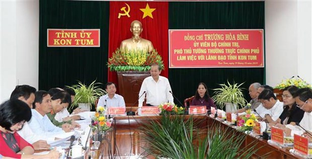 | Phó Thủ tướng thường trực Trương Hòa Bình phát biểu tại buổi làm việc với lãnh đạo tỉnh Kon Tum, sáng 19/10. (Ảnh: Cao Nguyên/TTXVN) |