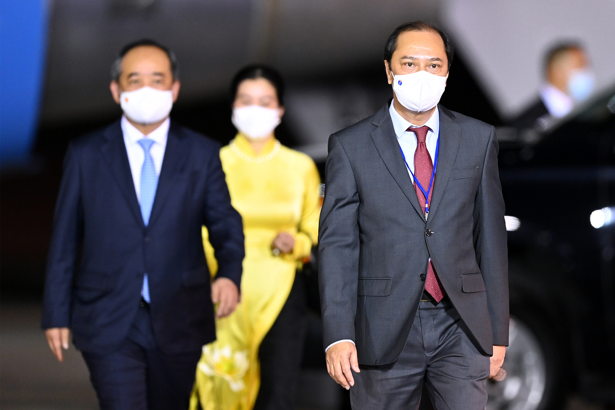 Các quan chức Việt Nam đón bà Harris đều đeo khẩu trang và đặt tay lên ngực thay cho nghi thức bắt tay, tuân thủ quy định phòng chống Covid-19.