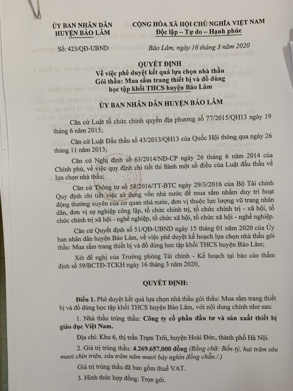 Theo đó tại gói thầu Mua sắm thiết bị đồ dùng cho khối Tiểu học của huyện Bảo Lâm thuộc dự toán Mua sắm thiết bị đồ dùng cho các trường của huyện Bảo Lâm năm 2018, Công ty cổ phần phát triển ứng dụng kỹ thuật công nghệ Việt Nam trúng thầu với giá 1.988.053.000 đồng (giá gói thầu 1.989.450.000 đồng) theo quyết định số 3033/QĐ-UBND ngày 28/12/2018.