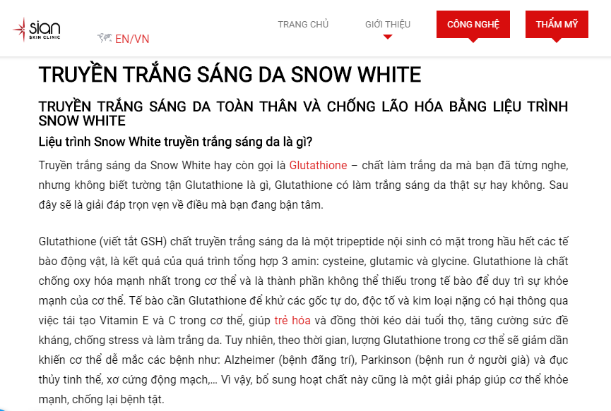Theo đó, Phòng Khám Chăm Sóc Da & Laser SIAN giới thiệu tới khách hàng phương pháp truyền trắng da với nội dung: "Tại SIAN, hiện tại đang có dịch vụ truyền trắng Snow White. Đây là liệu trình giúp làn da sáng màu hơn, chống lão hóa cho làn da của mình. Trong đó, có một hoạt chất đặc biệt gọi là Glutathione sẽ được truyền vào người mình. Đây là chất chống oxi hóa chính vì nó giúp tăng cường hệ thống miễn dịch loại bỏ gốc tự do dư thừa để chống lại quá trình lão hóa, chăm sóc da, làm sáng da và mịn da."
