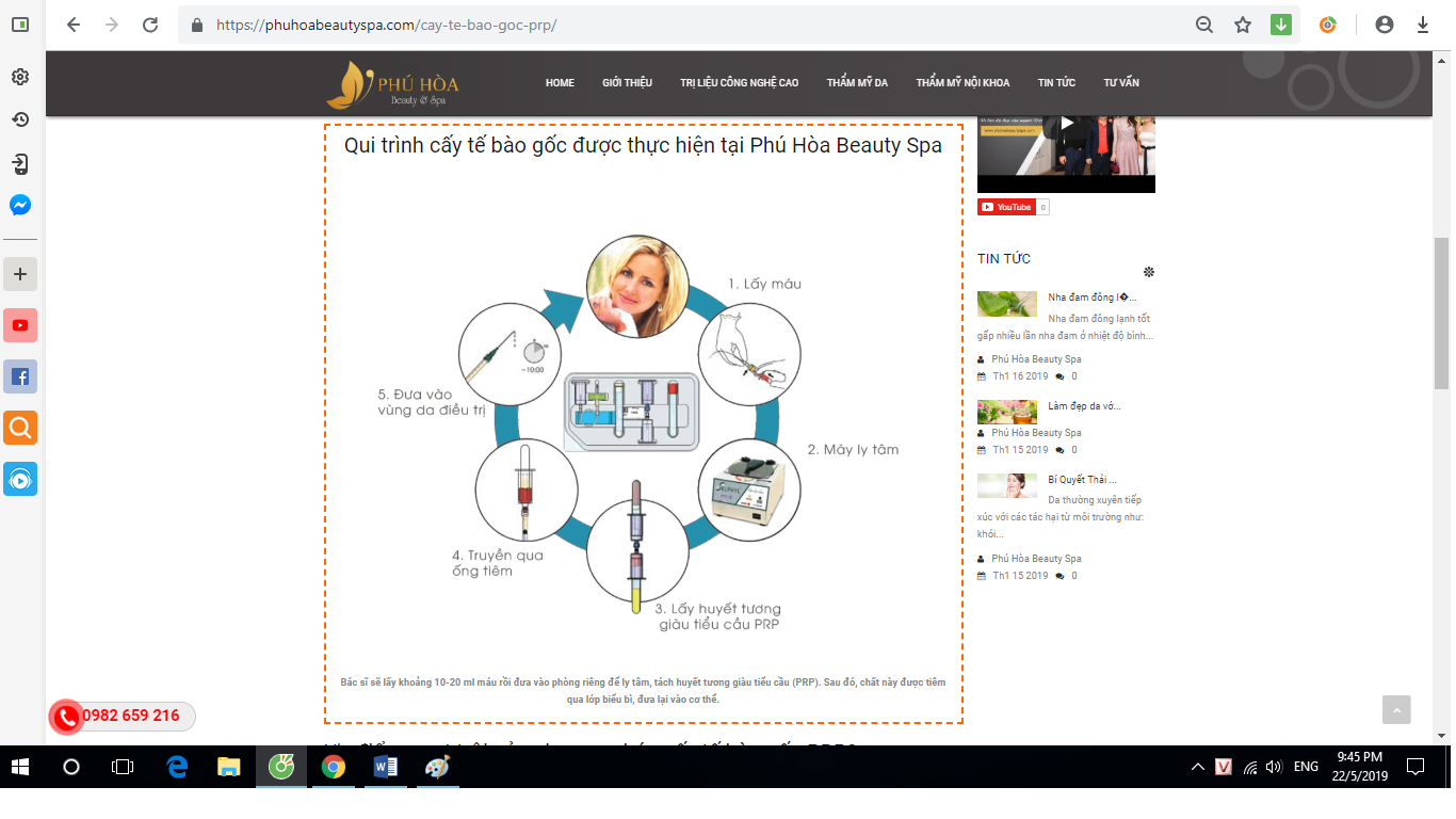 Ghi nhận trên trang web https://phuhoabeautyspa.com của Phú Hòa Beauty Spa (địa chỉ 484 Trần Khát Chân, quận Hai Bà Trưng, TP. Hà Nội) thời điểm ngày 22/5/2019, PV không khỏi giật mình khi đơn vị này quảng cáo rầm rộ dịch vụ: Cấy tế bào gốc PRP.