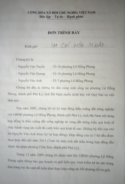 Trong đơn gửi tới Hoanhap.vn, các hộ dân trình bày: “Chúng tôi là Nguyễn Văn Anh, Nguyễn Văn Quang, Nguyễn Văn Tuyến là những hộ dân sinh sống trên địa bàn phường Lê Hồng Phong (TP. Phủ Lý). Vào năm 2002 chúng tôi có ký hợp đồng thầu đất ruộng nông nghiệp vùng trũng với UBND Phường Lê Hồng Phong để sản xuất đa canh, phát triển kinh tế tại địa phương theo mô hình vườn ao chuồng.