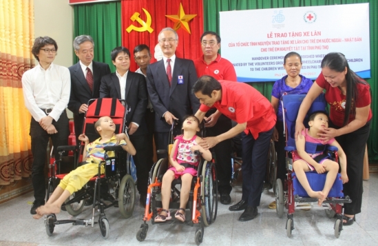 | Ông Đặng Minh Tiến - Trưởng ban Công tác xã hội - Quỹ Da cam T.Ư Hội Chữ thập đỏ Việt Nam và nhà tài trợ trao xe lăn cho trẻ em khuyết tật tại TP. Việt Trì và huyện Lâm Thao. |