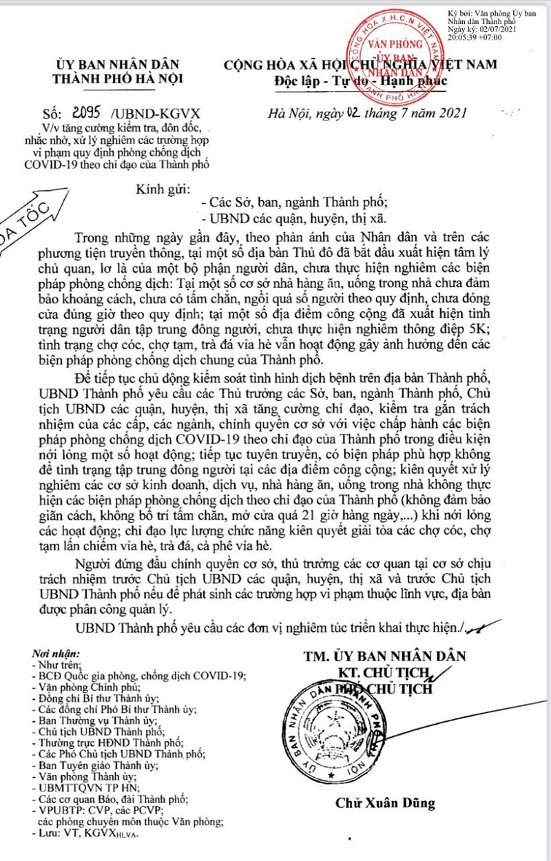 Ngày 2/7, UBND thành phố Hà Nội đã có công văn khẩn Số: 2905/ UBND-KGVX về việc tăng cường kiểm tra, đôn đốc, nhắc nhở, xử lý nghiêm các trường hợp vi phạm quy định phòng chống dịch Covid-19. Theo đó, nhận thấy sự lờ là của một bộ phận lớn người dân chưa thực hiện nghiêm các biện pháp phòng chống dịch: Tại một số nhà hàng ăn, uống trong nhà chưa đảm bảo khoảng cách, chưa có tấm chắn, ngồi quá số người theo quy định, chưa đóng cửa đúng giờ theo quy định; tại một số địa điểm công cộng đã xuất hiện tình trạng người dân tập trung đông người, chưa thực hiện nghiêm thông điệp 5K; tình trạng chợ cóc, chợ tạm, trà đá vỉa hè vẫn hoạt động gây ảnh hưởng đến các biện pháp phòng chống dịch chung của Thành phố.