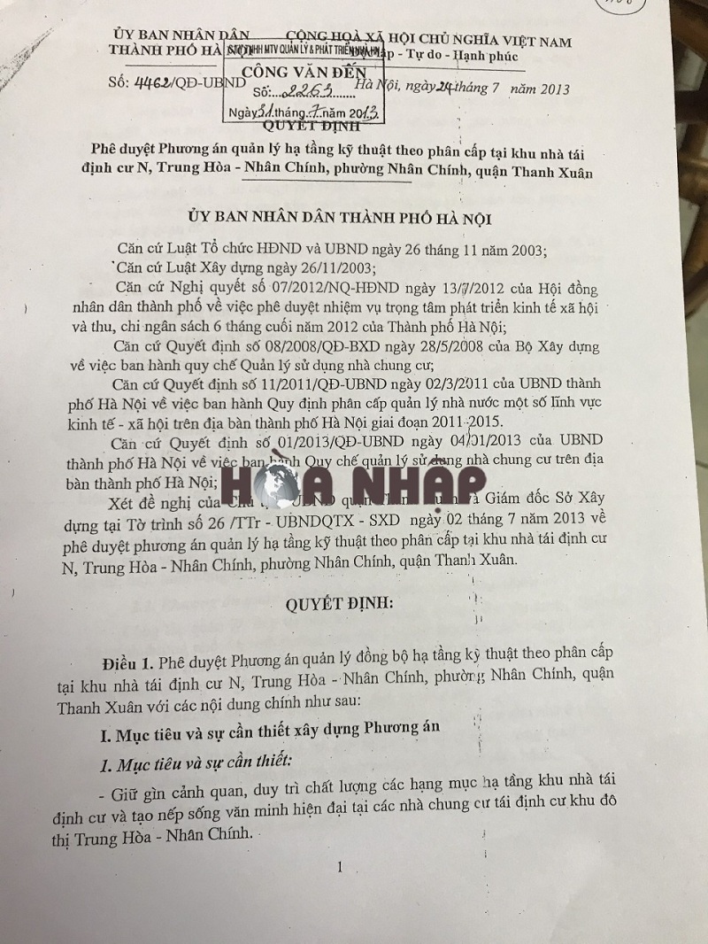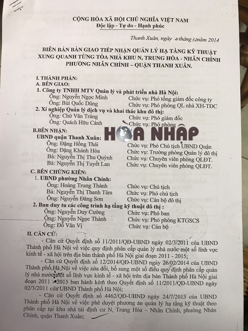 Biên bản bàn giao tiếp nhận quản lý hạ tầng kỹ thuật xung quanh từng tòa nhà, khu nhà N, Trung Hòa – Nhân Chính vào năm 2014.