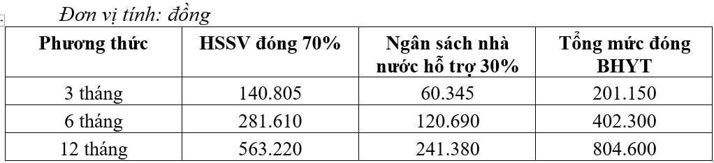 Cụ thể, mức đóng BHYT hàng tháng bằng 4,5% mức lương cơ sở (tương đương với 67.050 đồng/học sinh/ tháng và một năm là 804.600 đồng). Trong đó, ngân sách nhà nước hỗ trợ 30% mức đóng, học sinh, sinh viên chỉ đóng 70% nên số tiền thực tế mà mỗi học sinh, sinh viên sẽ đóng là 46.935 đồng/tháng, tương đương với 563.220 đồng/năm.