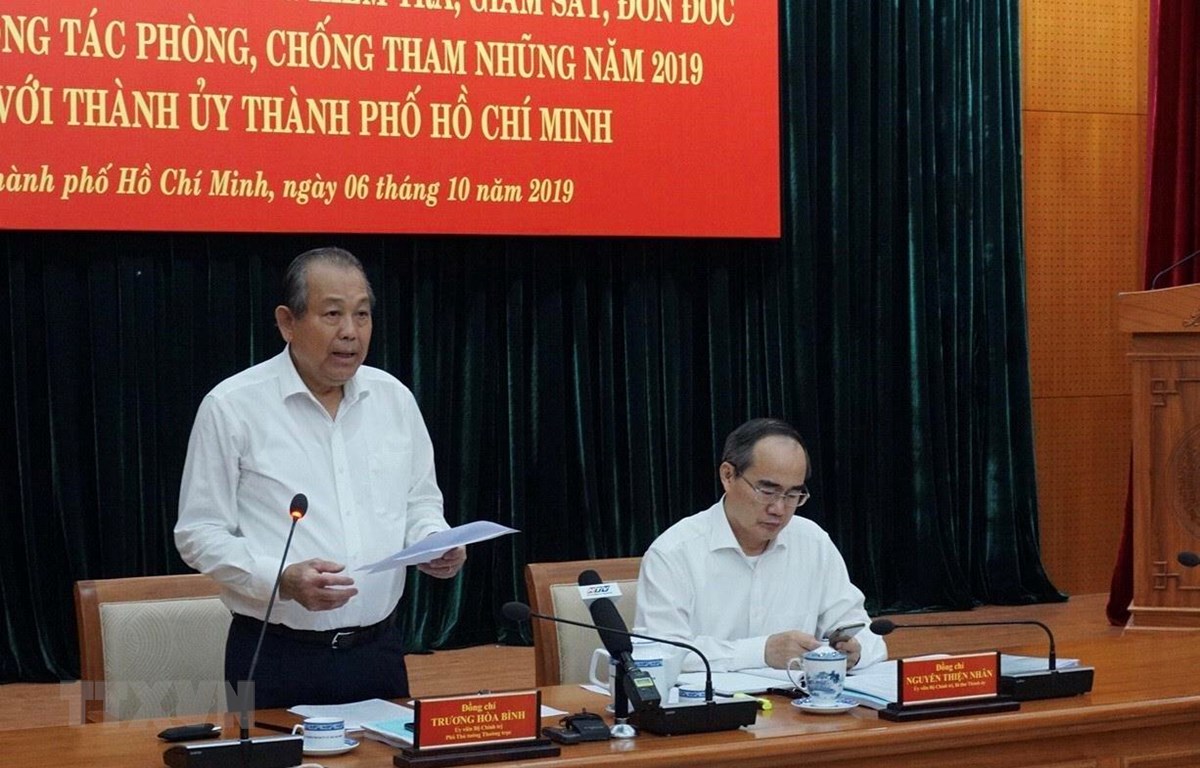 Chiều 6/10, Đoàn kiểm tra Ban Chỉ đạo Trung ương về phòng, chống tham nhũng do ông Trương Hòa Bình, Ủy viên Bộ Chính trị, Phó Thủ tướng Thường trực Chính phủ, Phó Trưởng ban Ban Chỉ đạo Trung ương về phòng, chống tham nhũng làm Trưởng đoàn đã làm việc với Thành ủy Thành phố Hồ Chí Minh để kiểm tra, giám sát, đôn đốc, chỉ đạo công tác phòng, chống tham nhũng năm 2019.