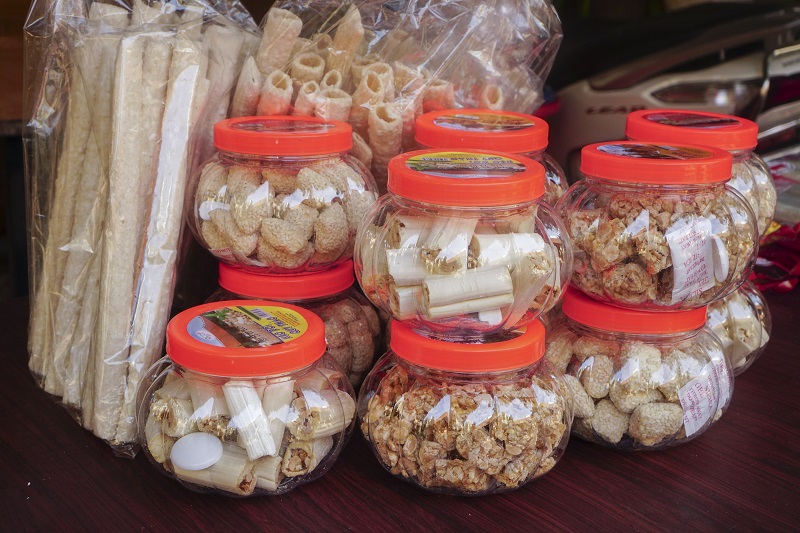 Đặc sản kẹo lạc, kẹo dồi được bày bán tại các gian hàng trong làng.