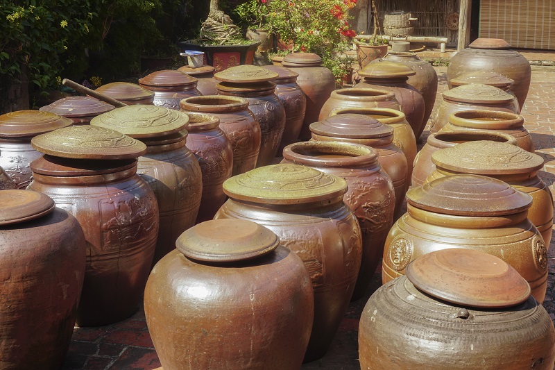 Đến nhà cổ Đường Lâm, du khách có thể dễ dàng bắt gặp những chiếc chum đựng tương xếp trước sân nhà. Nhà nào làm ít để dùng trong gia đình thì có 2-3 chiếc, còn với những nhà làm tương để phục vụ khách du lịch, sẽ có gần 30 chiếc chum đặt kín sân vườn. Gia đình ông Hà Hữu Thể ở xóm Sui, thôn Mông Phụ có nghề làm tương nổi tiếng nhiều đời nay. Mỗi năm gia đình ông sản xuất từ 5.000 - 7.000 lít tương cung cấp cho các đại lý và du khách.