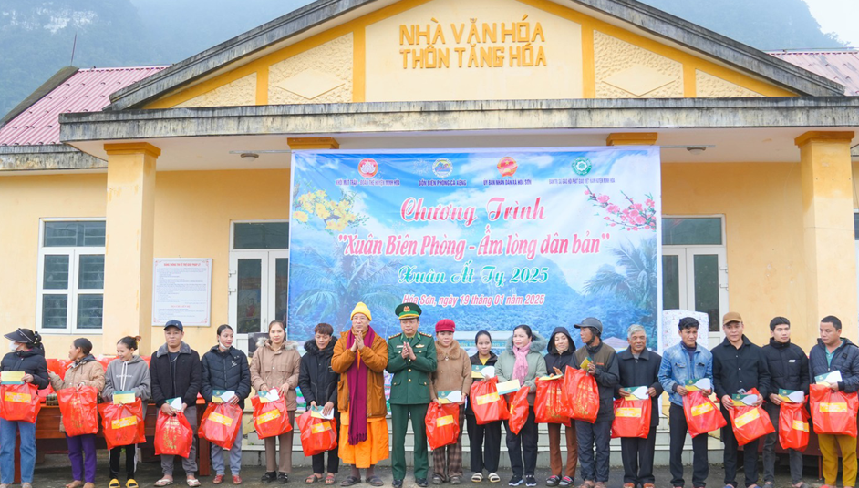 Theo đó, Ban Trị sự GHPGVN huyện Minh Hóa thống nhất với Bộ chỉ huy Bộ đội Biên phòng tỉnh Quảng Bình, cùng tổ chức chương trình “Xuân biên phòng-Ấm lòng dân bản” vùng biên ải, tại các đồn biên phòng Cà Xèng, Ra Mai và Cha Lo. Tại đây, Ban Trị sự GHPGVN huyện Minh Hóa đã trao 414 suất quà Tết, tổng giá trị khoảng 159 triệu đồng cho các hộ gia đình có hoàn cảnh đặc biệt của xã Hóa Sơn, xã Thượng Hóa, xã Trọng Hóa và xã Dân Hóa; đồng thời tặng quà động viên cán bộ - chiến sĩ thường trực canh phòng an ninh biên giới xuyên Tết Ất Tỵ.