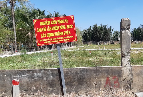 Theo ghi nhận, toàn bộ những lô đất được các cò đất giới thiệu đều có dấu hiệu san lấp, lấn chiếm kênh rạch. Những hàng cọc được đóng bao quanh phần đất phía mép sông và được bồi đắp ngang bằng với phần đất hiện hữu. Thậm chí, có những người còn treo bảng “cho đổ xà bần” nhằm đỡ tiền san lấp ngay trên phần đất mà họ đang san lấp.