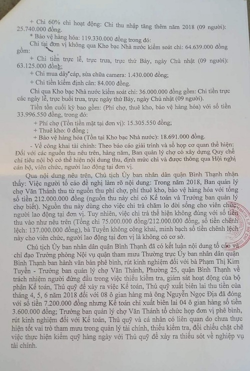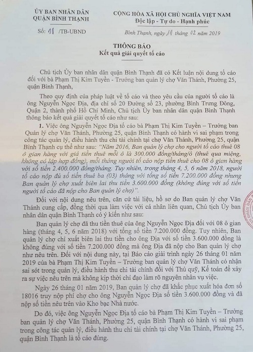 Chủ tịch Uỷ ban nhân dân quận Bình Thạnh đã có kết luận nội dung tố cáo và chỉ đạo Trưởng phòng Nội vụ quận tham mưu Thường trực Uỷ ban nhân dân quận Bình Thạnh ban hành văn bản phê bình, rút kinh nghiệm đối với bà Phạm Thị Kim Tuyền - Trưởng ban quản lý chợ Văn Thánh , Phường 25, quận Bình Thạnh về trách nhiệm người đứng đầu trong vụ việc thiếu kiểm tra, giám sát hoạt động của bộ phận Kế toán , Thủ quỹ để xảy ra vụ việc Kế toán ,Thủ quỹ xuất biên lai thu tiền của tháng 4,5,6 năm 2018 đối với 08 ô gian hàng mà ông Nguyễn Ngọc Địa đã đóng với số tiền 7.200.000 VNĐ nhưng Kế toán chỉ xuất biên lai 04 gian hàng số tiền 3.600.000 VNĐ, Trưởng ban quản lý chợ Văn Thánh tổ chức họp đơn vị phê bình , rút kinh nghiệm đối với Kế toán, Thủ quỹ và cá nhân có liên quan do chưa thực hiện tốt vai trò tham mưu trong quản lý tài chính, thiếu kiểm tra đối chiếu chặt chẽ việc thực hiện kiểm quỹ hàng ngày với Thủ quỹ để xảy ra thiếu sót về nghiệp vụ tài chính.
