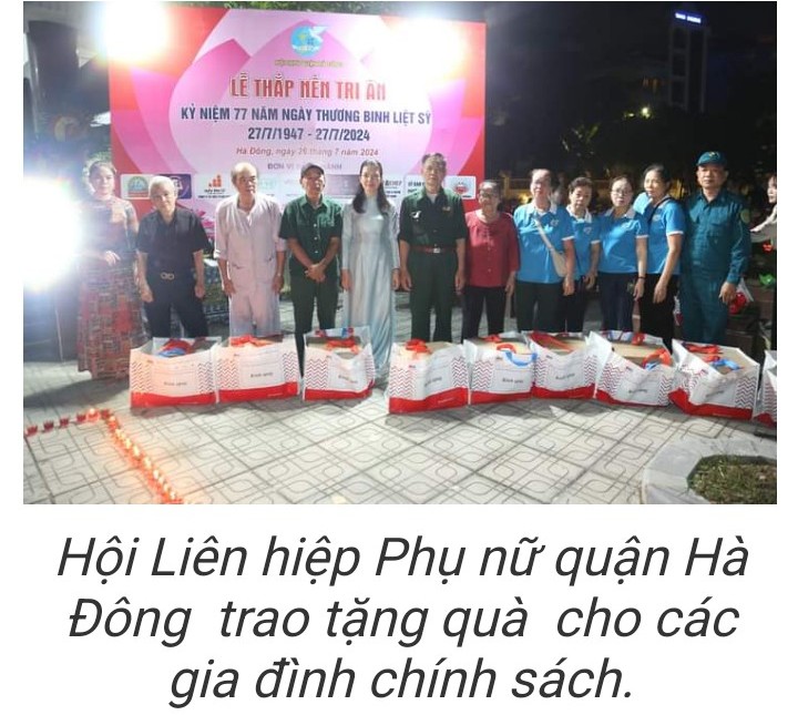 Tại chương trình, Hội Liên hiệp Phụ nữ quận Hà Đông đã trao tặng 20 suất quà trị giá 40 triệu đồng cho đại diện các gia đình chính sách.