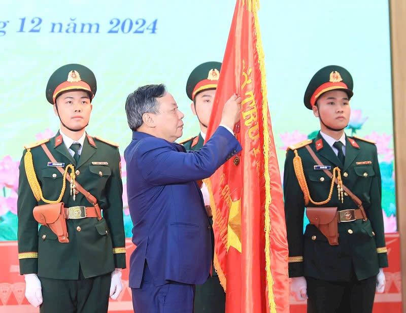 Đồng chí Nguyễn Văn Phong, Phó Bí thư Thường trực Thành ủy Hà Nội gắn Huân chương Lao động hạng Nhất lên lá cờ truyền thống quận Hoàng Mai (Ảnh: Quang Thái).