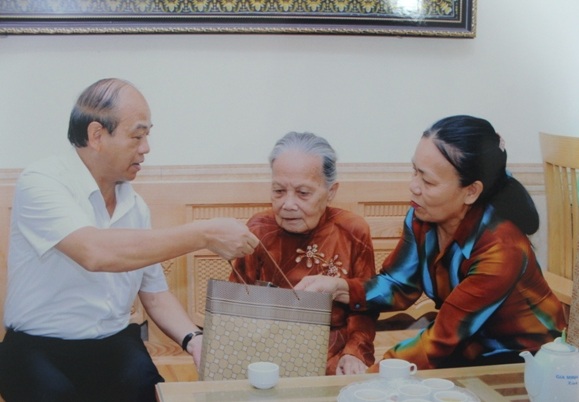 | Bí thư Quận ủy Hoàng Mai Nguyễn Đức Vinh tặng quà cho gia đình chính sách. |