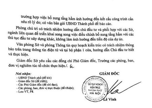 Tại Thông báo số 1823/TB-QHKT ngày 14/4/2016 của Sở Quy hoạch kiến trúc Hà Nội đã nêu rõ: Ngày 24/3/2016 Thành ủy Hà Nội đã có thông báo số 83-TB/TU thông báo Kết luận của Thường trực Thành ủy về việc triển khai một số nhiệm vụ trọng tâm trong thời gian tới trong đó có nội dung: Trong thiết kế và xây dựng phải bố trí 3 tầng hầm để xe, xây dựng nhà vệ sinh công cộng phục vụ dự án và nhu cầu chung của thành phố. Giám đốc Sở chỉ đạo các phòng ban, các đơn vị thuộc Sở trong quá trình thẩm định các đồ án, dự án thực hiện nghiêm túc các nội dung sau: