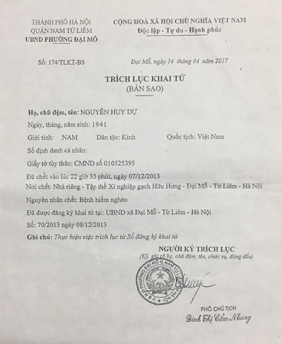 | Trích lục Giấy khai tử của ông Nguyễn Huy Dự |