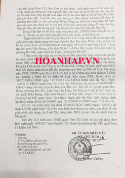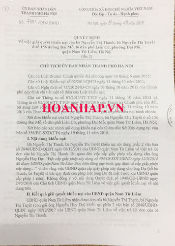 Không đồng ý với kết quả trả lời từ phía UBND quận Nam Từ Liêm, chị Thanh, chị Tuyết đã gửi đơn lên UBND thành phố Hà Nội khiếu nại về kết luận trên. Tại Điều 1, Quyết định số 7001/QĐ-UBND ngày 27/12/2018 của UBND thành phố Hà Nội do Phó Chủ tịch Nguyễn Thế Hùng ký nêu rõ: “Khiếu nại của bà Nguyễn Thị Thanh, bà Nguyễn Thị Tuyết đối với nội dung phần 2 văn bản số 2846/UBND-QLĐT ngày 08/12/2017 của UBND quận Nam Từ Liêm là có cơ sở”. Và, “Việc bà Nguyễn Thị Thanh và bà Nguyễn Thị Tuyết khiếu nại và đề nghị hủy nội dung phần 2 văn bản số 846/UBND-QLĐT ngày 08/12/2017 của UBND quận Nam Từ Liêm là có cơ sở”.