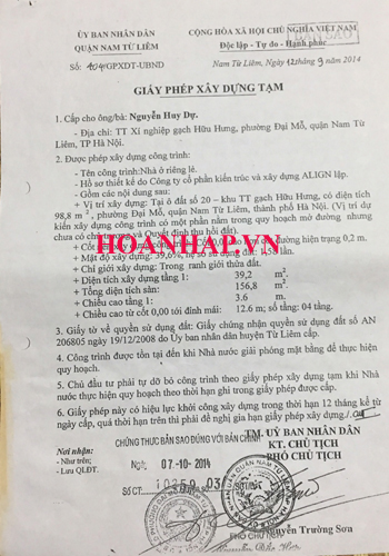 Qua các cuộc làm việc về vấn đề nêu trên, UBND phường Đại Mỗ chúng tôi được biết: Ngôi nhà 4 tầng mà gia đình bà Thanh xây dựng đã được UBND quận Nam Từ Liêm cấp giấy phép xây dựng 404/GPXDT-UBND, ngày 12/9/2014, do Phó Chủ tịch Nguyễn Trường Sơn ký, mang tên bố tôi là ông Nguyễn Huy Dự.