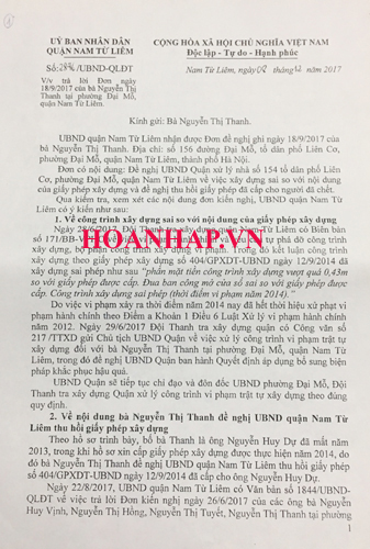 Trước sự việc nêu trên bà Nguyễn Thị Thanh đã làm Đơn khiếu nại gửi các cơ quan liên quan, nội dung phần 2 tại văn bản số 2846/UBND-QLĐT, ngày 08/12/2017 về việc trả lời đơn ngày 18/9/2017 của bà Nguyễn Thị Thanh và Quyết định số 1940/QĐ-UBND, ngày 24/5/2018 về việc giải quyết khiếu nại của bà Nguyễn Thị Thanh, bà Nguyễn Thị Tuyết tại phường Đại Mỗ, quận Nam Từ Liêm do Phó Chủ tịch Nguyễn Huy Cường ký khẳng định: “Về việc cấp Giấy phép xây dựng số 404/GPXDT-UBND ngày 12/9/2014 đã được UBND quận Nam Từ Liêm thực hiện theo đúng quy trình, quy định về cấp giấy phép xây dựng của Luật Xây dựng năm 2003 và các văn bản dưới luật có liên quan”.