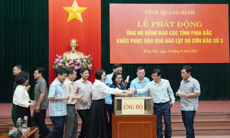 Để kịp thời chia sẻ, động viên các địa phương bị thiệt hại nặng nề do bão số 3, tỉnh Quảng Bình quyết định hỗ trợ 2,5 tỷ đồng cho các tỉnh phía Bắc khắc phục hậu quả bão, lũ. Số tiền này sẽ được chuyển đến Ủy ban Trung ương MTTQVN để hỗ trợ người dân bị ảnh hưởng bởi bão, lũ.