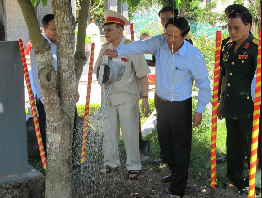 | Đồng chí Lê Văn Thành trồng cây lưu niệm và chụp ảnh với các đại biểu |