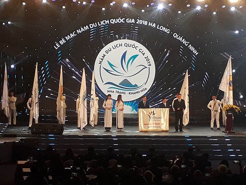 Đồng chí Nguyễn Ngọc Thiện, Ủy viên Trung ương Đảng, Bộ trưởng Bộ Văn hóa, Thể thao và Du lịch, Trưởng ban Chỉ đạo Năm Du lịch quốc gia 2018 trao cờ luân lưu cho tỉnh Khánh Hòa, là tỉnh đăng cai tổ chức Năm Du lịch quốc gia 2019.