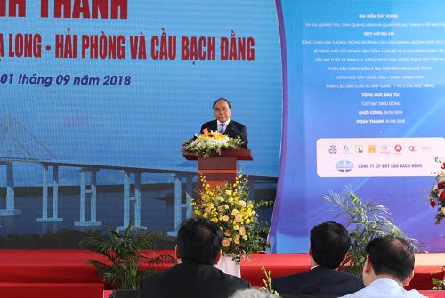 | Thủ tướng Nguyễn Xuân Phúc phát biểu tại lễ khánh thành và thông xe đường cao tốc Hạ Long - Hả Phòng và cầu Bạch Đằng. |