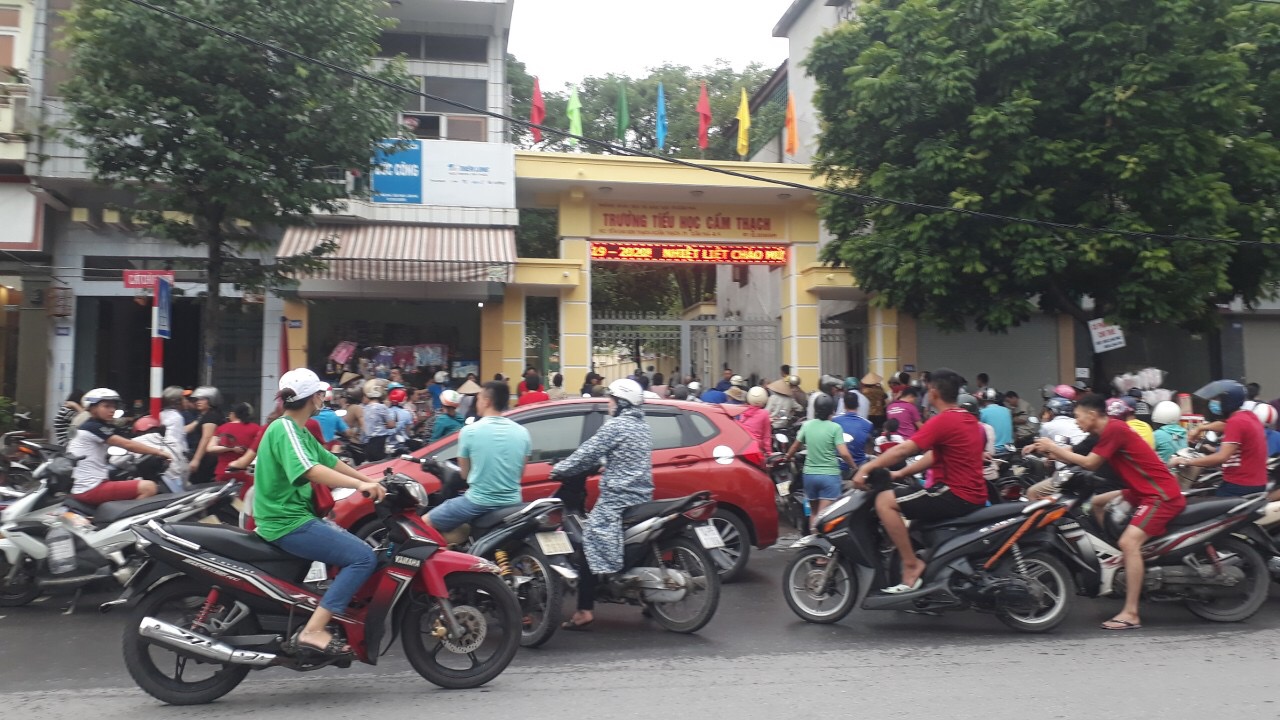 | Phụ huynh đón con em sau giờ tan học tại cổng trường tiểu học Cẩm Thạch |