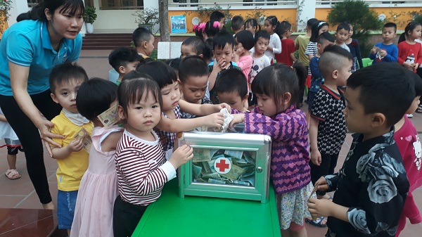 Cô, trò trường Mầm Non Hạ Long quyên góp, trao tận tay tiền ủng hộ cho Đội văn nghệ Tình thương
