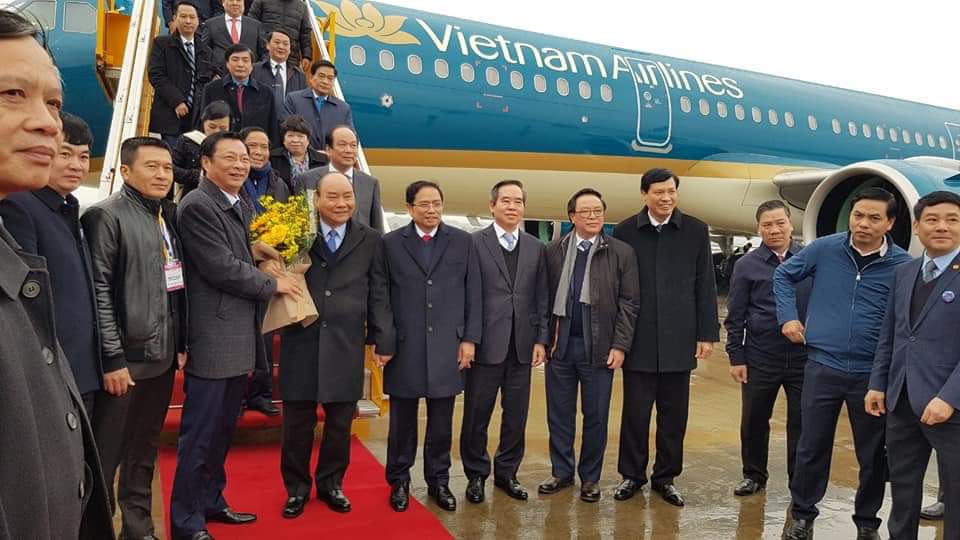 Các đồng chí lãnh đạo Tỉnh Quảng Ninh đón và tặng hoa Thủ tướng Chính phủ Nguyễn Xuân Phúc tại Cảng sân bay Quốc tế Vân Đồn.