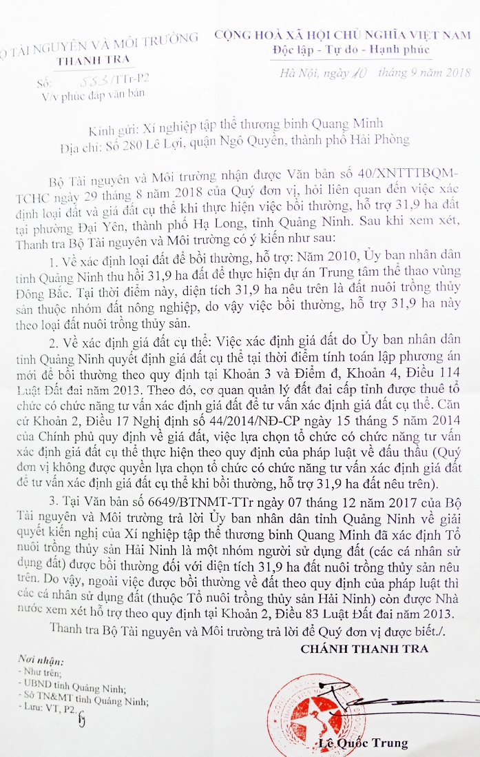 Ngày 07/12/2017, Bộ Tài nguyên và Môi trường đã có Công văn số 6649/BTNMT-TTr khẳng định việc bồi thường và hỗ trợ trên 31,9ha đầm nuôi trồng thủy sản cho thương binh của Xí nghiệp tập thể thương binh Quang Minh là đúng pháp luật. Ngày 11/4/2018, Cục Người có công Bộ Lao động – Thương binh và Xã hội cũng ban hành Văn bản 711/NCC – TTTD đôn đốc tỉnh Quảng Ninh “đảm bảo quyền lợi, tránh gây bức xúc trong tập thể thương binh”. Ngày 29/01/2018, Thanh tra Bộ Tài nguyên và Môi trường đã có Công văn số 70/TTr –P2, trả lời Sở Tài nguyên và Môi trường tỉnh Quảng Ninh nêu quan điểm của Bộ và hướng dẫn cụ thể việc đền bù.