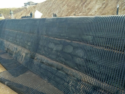 Không chỉ tiên phong sử dụng điện năng lượng tái tạo, những người chủ của dự án Monaco Hạ Long Luxurious Villas tiếp tục đi trước trong việc đưa vật liệu xây dựng mới, bền chắc, thân thiện với môi trường vào xây dựng hạ tầng đô thị: Đó là triển khai xây dựng hệ thống lưới địa kỹ thuật vào xây dựng hệ thống kè theo công nghệ tiên tiến trong xây dựng công trình vượt thổ san nền, để xây dựng tường chắn đất thay công nghệ xây kè bằng đá hộc, xi măng cốt thép trước đây. Để thực hiện công việc này, Dự án đã nhập khẩu 162.770m2 lưới địa kỹ thuật, 80.000m ống thấm thoát nước HDPE thông thủy tứ diện cùng nhiều vật tư đồng bộ đi kèm của các nước Ấn Độ, Đài Loan, triển khai xây dựng hệ thống kè, cốt kè cao từ 7 đến 17m (theo địa hình) với chiều dài toàn tuyến trên 800m. Với hệ thống lưới địa kỹ thuật này, dự án thi công theo quy cách chia tầng cắt lớp, do đó các lớp đất được dải lưới địa kỹ thuật và lu lèn kỹ, bao đất phía ngoài được cố định bằng lưới địa kỹ thuật, phủ trùm sâu vào từ 8 - 12m trong lòng đất nền, sau đó ghim bằng các neo thép, vững chắc, không xô đổ. Ống thoát nước ngầm đặt trong lòng đất tứ diện thông thủy, khoảng cách đặt đường ống hợp lý, hình thành mạch nước ngầm nhân tạo trong lòng đất, phía ngoài có máng xây đón nước, do đó vào mùa mưa, đất ngậm nước đến đâu, thoát ngay đến đó, không bị dồn nén, ứ đọng dẫn đến sạt lở kè.