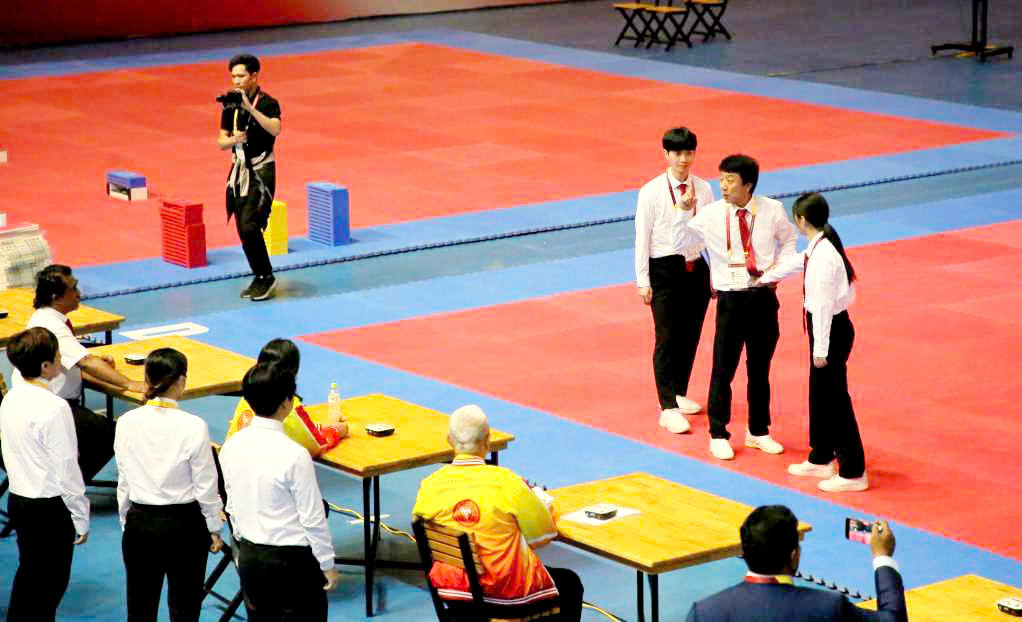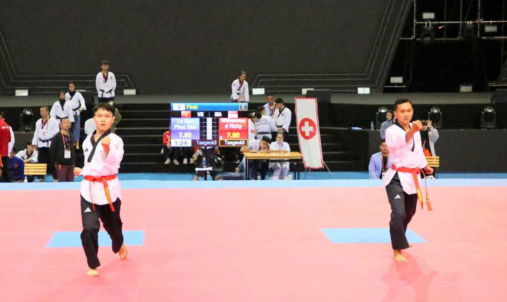 VĐV Việt Nam và VĐV Indonesia tranh tài ở nội dung quyền cá nhân nam.