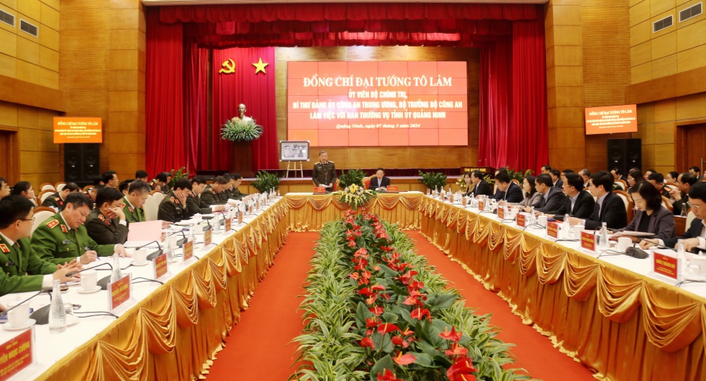 Phát biểu chỉ đạo tại buổi làm việc, Đại tướng Tô Lâm, Bộ trưởng Bộ Công an đánh giá cao những kết quả mà Đảng bộ chính quyền nhân dân các dân tộc tỉnh Quảng Ninh đạt được từ đầu nhiệm kỳ Đại hội Đảng bộ tỉnh lần thứ XV tới nay. Dù đối diện với nhiều khó khăn, thách thức mới xuất hiện, phức tạp, nhưng bằng sự đoàn kết, thống nhất ý chí và hành động, truyền thống “Kỷ luật và Đồng tâm”, Đảng bộ, chính quyền, lực lượng vũ trang và nhân dân Quảng Ninh đã tự lực, tự cường, năng động, sáng tạo, chủ động vượt qua mọi trở ngại và đạt được những thành tựu rất quan trọng…