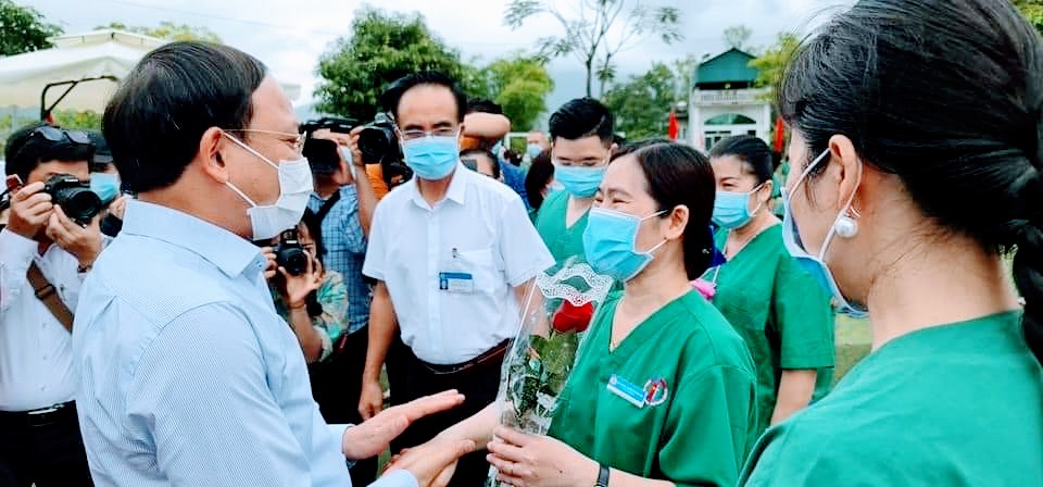 Đồng chí Bí thư Tỉnh ủy ghi nhận, biểu dương tinh thần quyết tâm cao, sự trưởng thành vượt bậc của ngành Y tế Quảng Ninh và trình độ chuyên môn của các y, bác sĩ Bệnh viện Việt Nam - Thụy Điển Uông Bí - một bệnh viện từ tuyến Trung ương nay trực thuộc tỉnh, cùng bề dày truyền thống đã được thử thách, rèn luyện, kinh nghiệm dày dặn qua quá trình đảm nhiệm nhiệm vụ thu dung, điều trị toàn bộ ca bệnh Covid-19 trên địa bàn 2 địa phương Uông Bí, Đông Triều, thần tốc truy vết, lấy mẫu, xét nghiệm và trả kết quả nhanh nhất, góp phần khóa chặt ổ dịch tại Đông Triều trong đợt bùng phát dịch thứ 3.