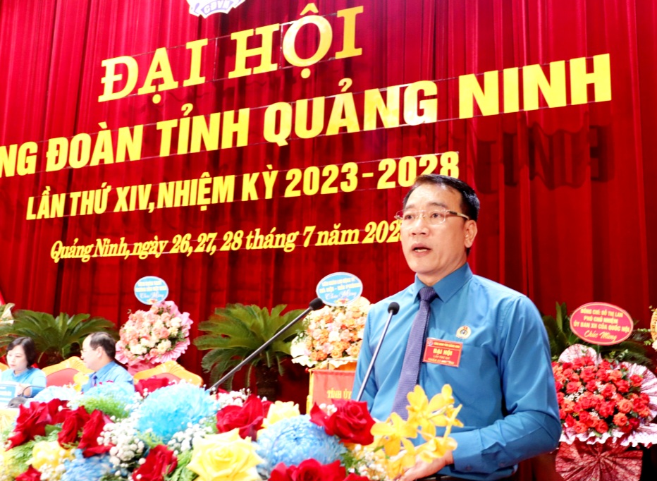 Đồng chí Tô Xuân Thao, Chủ tịch LĐLĐ tỉnh Quảng Ninh khóa XIV, nhiệm kỳ 2023- 2028 phát biểu bế mạc Đại hội.