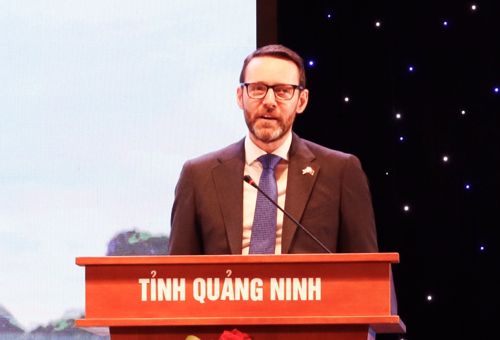 Ngài Iain Frew, Đại sứ đặc mệnh toàn quyền Vương quốc Anh tại Việt Nam phát biểu tại hội nghị, cam kết sẵn sàng tạo điều kiện để các doanh nghiệp Anh tìm hiểu cơ hội hợp tác đầu tư các lĩnh vực DL tại Quảng Ninh.