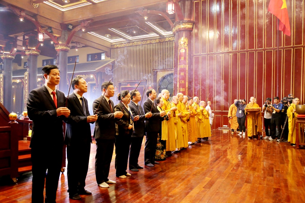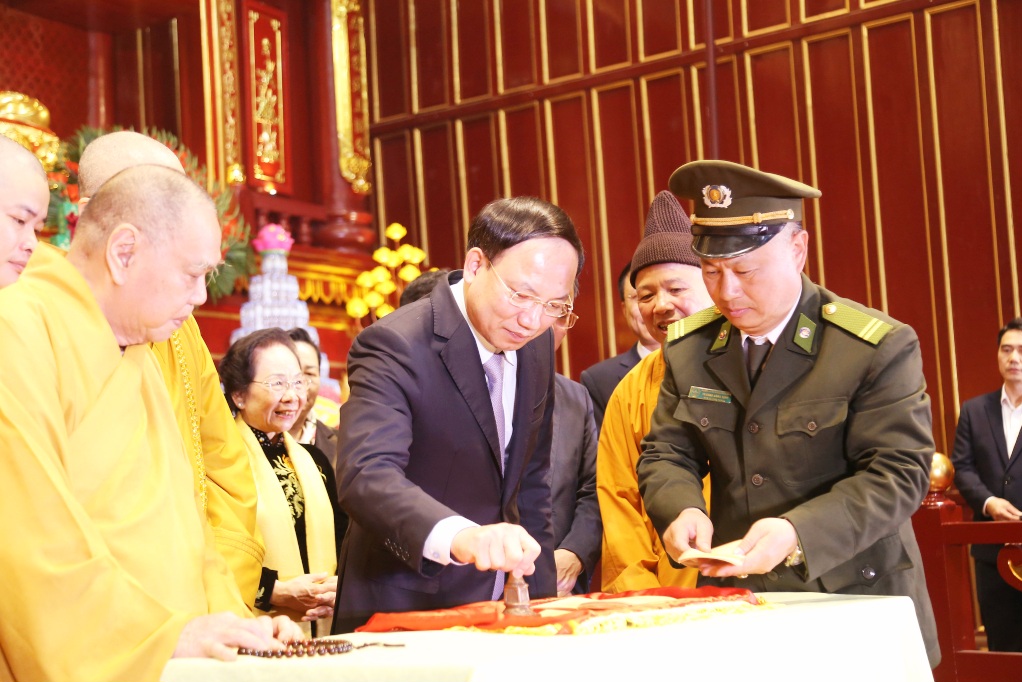 Đồng chí Nguyễn Xuân Ký, Ủy viên Trung ương Đảng, Bí thư Tỉnh ủy, Chủ tịch HĐND tỉnh, cùng các đại biểu làm lễ đóng dấu thiêng Yên Tử (Ảnh Báo QN)
