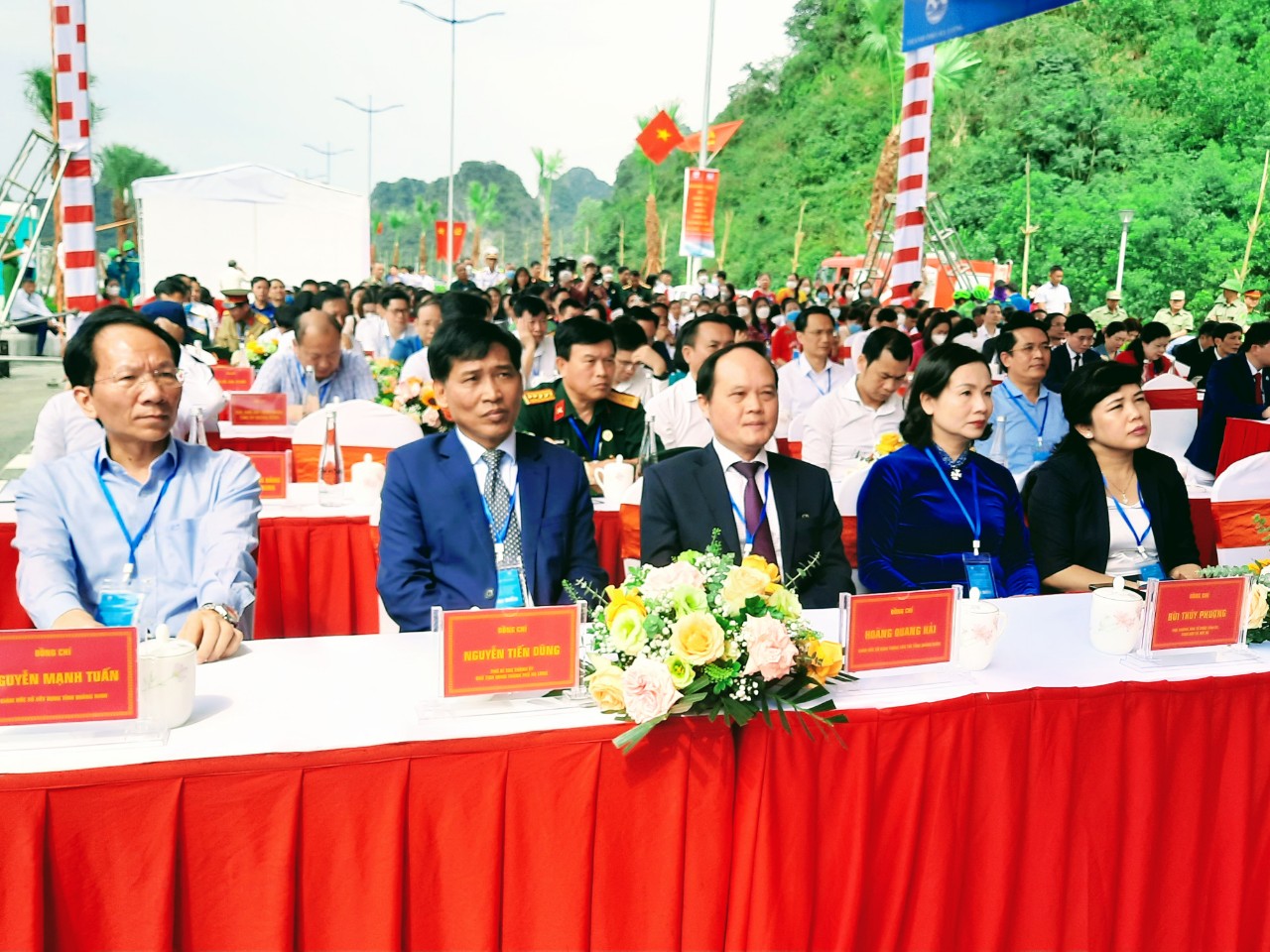 Các đồng chí Lãnh đạo tỉnh và hai TP Hạ Long - Cẩm phả cắt băng khánh thành tuyến đường