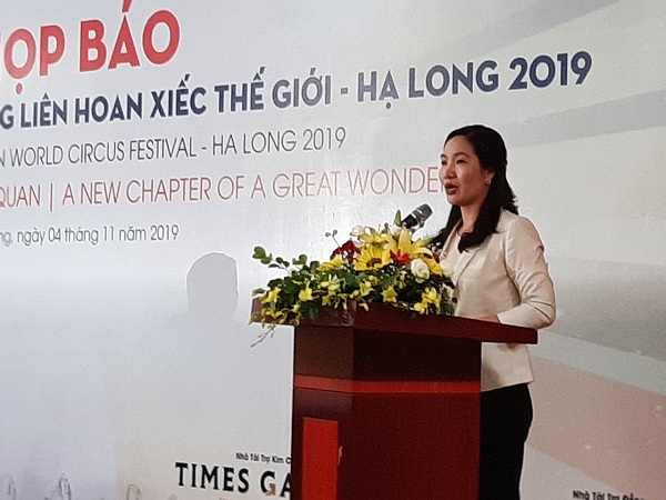 | Bà Nguyễn Thị Hạnh, Giám đốc Sở Văn hóa - Thể thao Quảng Ninh, Trưởng Ban Tổ chức Liên hoan xiếc Thế giới - Hạ Long 2019 phát biểu tại buổi họp báo |