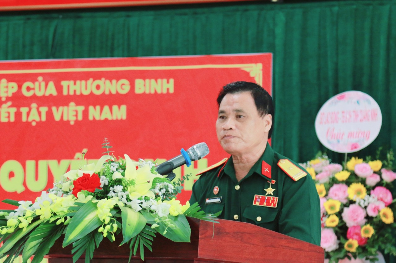 Ông Trần Hồng Quảng, Thương binh ¼, Anh hùng Lao động, Ủy viên Ủy ban Trung ương Mặt trận Tổ quốc Việt Nam, Chủ tịch Hiệp hội phát biểu tại buổi Lễ