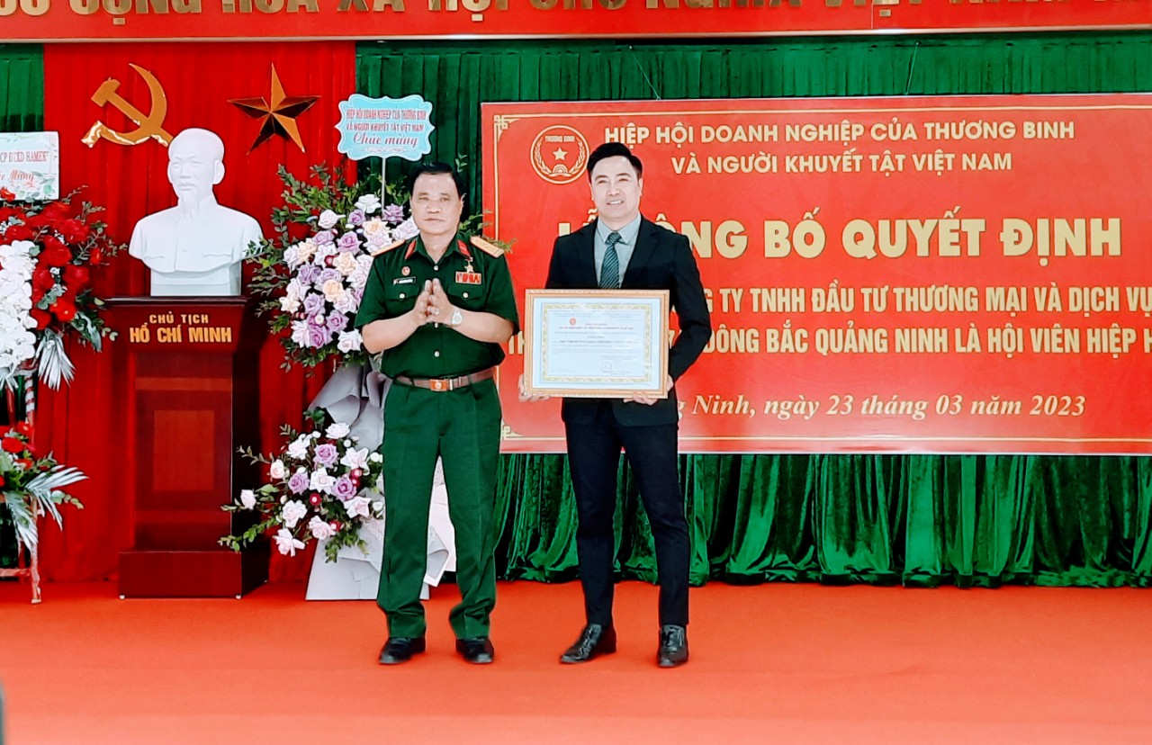 Tới dự và trao Quyết định Công nhận Công ty TNHH Đầu tư thương mại và Dịch vụ Thương binh 27/7 Đông Bắc Quảng Ninh là Hội viên chính thức của Hiệp hội VAIDE, ông Trần Hồng Quảng, Thương binh ¼, Anh hùng Lao động, Ủy viên Ủy ban Trung ương Mặt trận Tổ quốc Việt Nam, Chủ tịch Hiệp hội ghi nhận và đánh giá cao nỗ lực của Công ty Trách nhiệm hữu hạn Đầu tư Thương mại và Dịch vụ Thương binh 27 - 7 Đông Bắc, Quảng Ninh trong thời gian vừa qua. Đồng thời chấp thuận Đơn xin gia nhập Hiệp hội và tổ chức trao Quyết định Công nhận Hội viên cho Công ty Trách nhiệm hữu hạn Đầu tư Thương mại và Dịch vụ Thương binh 27 - 7 Đông Bắc, Quảng Ninh. Lễ trao Quyết định Công nhận Hội viên hôm nay được tổ chức trọng thể với sự chứng kiến của đông đảo các Vị đại biểu khách quý. Đồng thời nhấn mạnh, đây thật sự là ngày hội, là dấu mốc quan trọng đánh dấu bước phát triển mới của Hiệp hội và doanh nghiệp Hội viên.