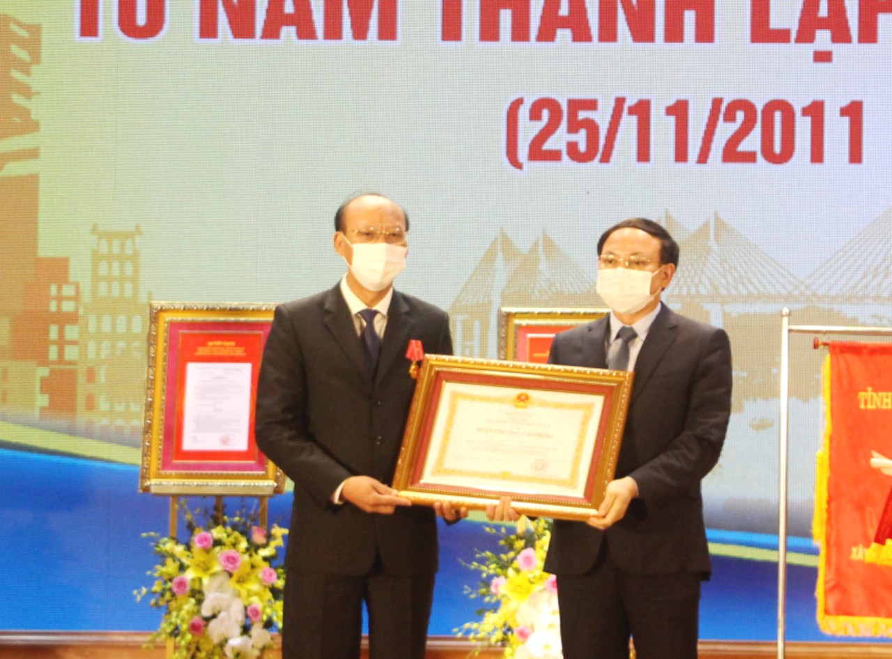 Ông Nguyễn Xuân Ký, Ủy viên Trung ương Đảng, Bí thư Tỉnh ủy, Chủ tịch HĐND tỉnh, trao Huân chương Lao động hạng Ba của Chủ tịch nước cho đồng chí Trần Đức Thắng, Chủ tịch UBND TX Quảng Yên.