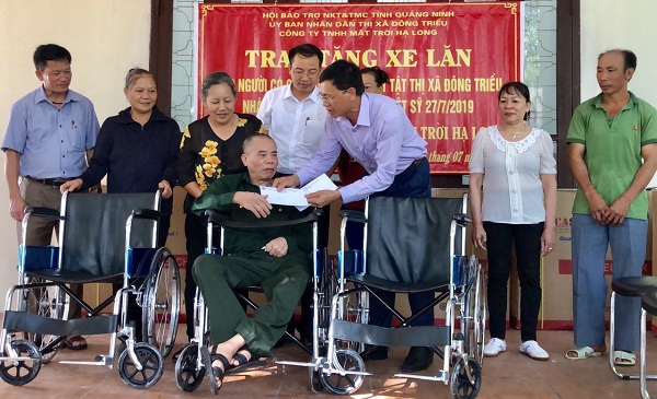 | Hội bảo trợ NKT và Hội Bảo trợ TMC tỉnh Quảng Ninh trao tặng xe lăn cho người khuyết tật thị xã Đông Triều. |