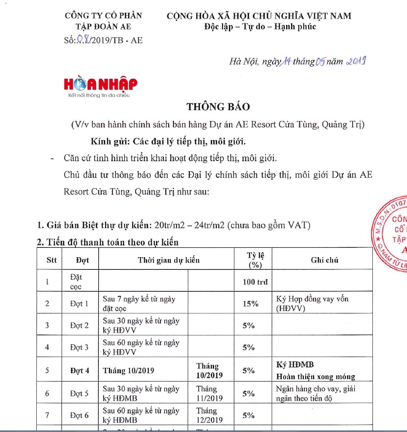 Đồng thời, nhiều nội dung Hòa Nhập cũng mong Chủ tịch UNBD tỉnh Quảng Trị cung cấp thông tin, để trả lời bạn đọc: Nghĩa vụ tài chính Tập đoàn AE đã hoàn thiện chưa? Với dự án AE Resort Cửa Tùng, Chủ đầu tư đã đủ điều kiện để mở bán chưa? Và, để thực hiện được dự án Khu đô thị sinh thái biển AE Resort Cửa Tùng Quảng Trị, UBND tỉnh Quảng Trị có gửi và nhận được văn bản tham mưu của các bộ ngành, như Bộ Tài nguyên và Môi trường; Bộ Nông nghiệp và Phát triển nông thôn; Bộ Quốc phòng; Bộ Văn hóa thể thao và Du lịch… không?