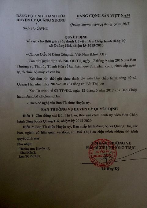 Quyết định của Thường vụ Huyện ủy Quảng Xương về việc cho bà Lan nghỉ việc