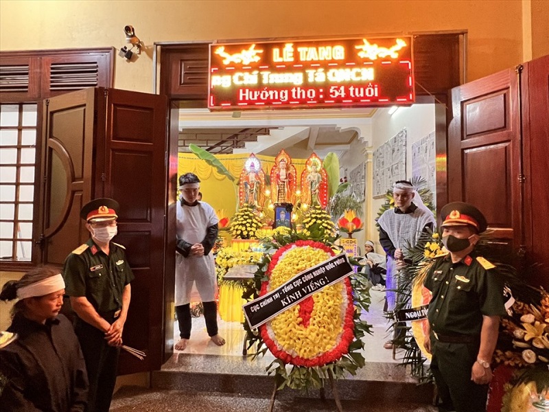 Lễ viếng đồng chí Trung tá Bùi Văn Nhiên được tổ chức trọng thể tại nhà riêng. (Ảnh: Nam Anh)
