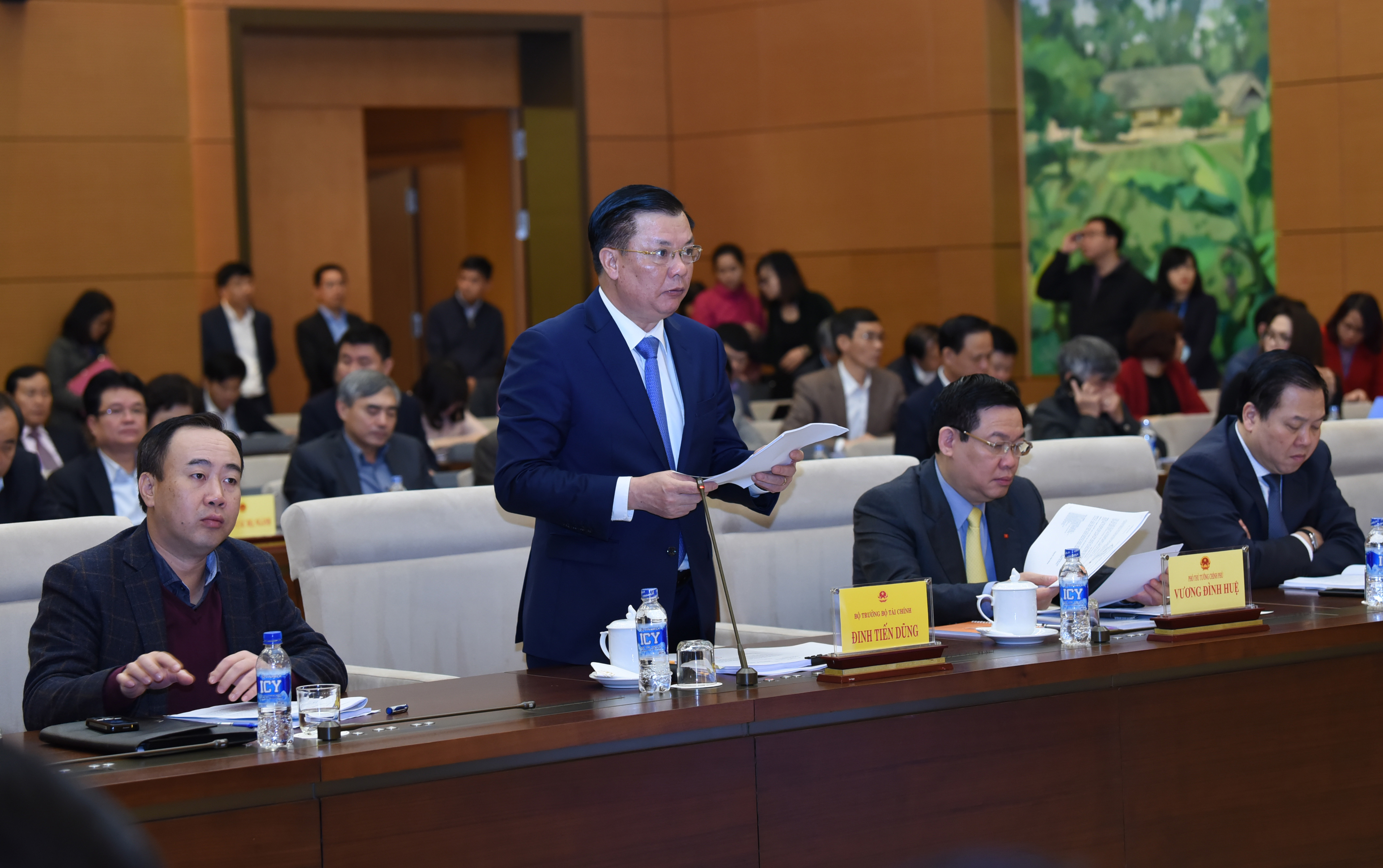 Chủ trì buổi làm việc là Phó Chủ tịch Quốc hội Phùng Quốc Hiển. Về phía Chính phủ có Phó Thủ tướng Vương Đình Huệ, Bộ trưởng Bộ Tài chính Đinh Tiến Dũng, Chủ tịch Ủy ban quản lý vốn Nhà nước tại doanh nghiệp Nguyễn Hoàng Anh, lãnh đạo các bộ, ngành, các tập đoàn, tổng công ty Nhà nước.